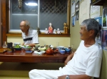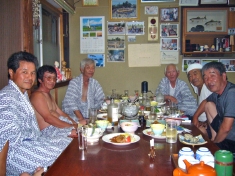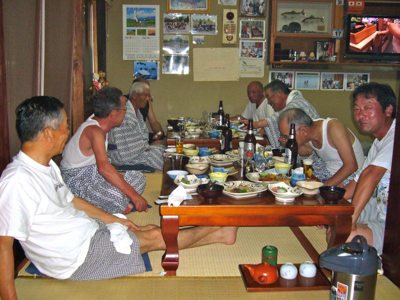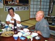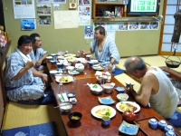 夜に、師匠の1人が宿入りする。食事をしている師匠と、そばで賑やかなグループが酒盛りをしている。