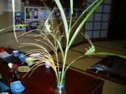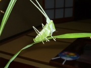 Eさん手作りのバッタの日の朝、食事後のテープルにペットポトルにススキが生けられている。窓からの風に揺られるススキの葉にバッタが2匹いるではないか。よく見ると作り物のバッタでビックリする。前日に、大川で入れ掛かりをしたEさんが朝作ったらしい。なんと、風流な置き土産を残して・・。Eさんは70歳と云っていたが、ずっと若く感じられた。