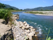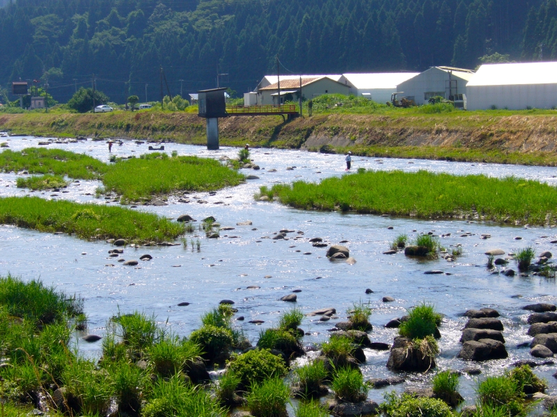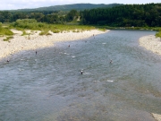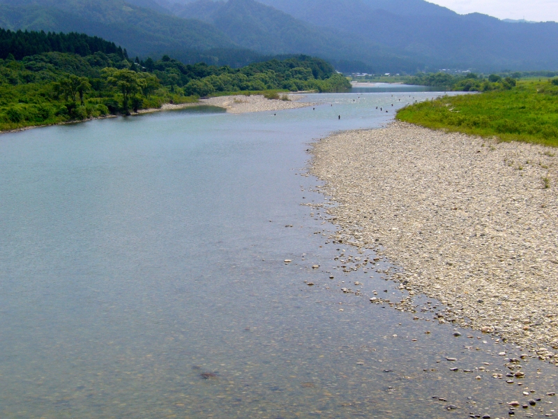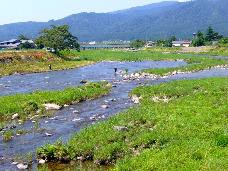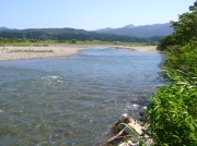 胎内川に移動することにした。橋のたもとのオトリ屋さんで釣り券を買う。話を聞くと上流は水量が多いので下流が良いと云う。鮎も移動しているときで遡上中だとか。そんな情報を聞いてから国道7号線より下流1K付近で川に入る。川の様子や石の舐め後をみると鮎はいる様だ。時計を見ると昼になっていた。