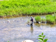 13日の朝、石さん達4人が宿に着いた。「親父も後でくる」と石さんに誘われたので「行くよ」と約束する。Mさん達二人に石さん達がいる場所に親父が行くので、そこを説明したつもりが二人は別の場所に行ってしまった様だ。11時頃に川に着くと2人はいたが石さんとTさんの姿が見えない。釣果を聞くと「渋いよ」の返事。支度をして親父も竿を出すとすぐに釣れる。その後3匹釣って、際を釣ろうとしてしていると石さんとTさんが戻ってきた。「釣れた」と聞くと「あんまり釣れねぇ」と答えて川から上がって昼食に入る。