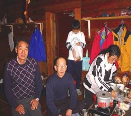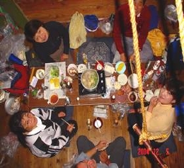 9時30分 山頂小屋に到着。2階付のログハウス風の立派な小屋、別名「スナック大峰」だそうです。(テーブル、座布団、コンロ、ハンガーまで揃っている。)小屋に荷物を置いて山頂までの往復。途中立派なキノコ(くりたけ)を発見、この時期だとやっぱり異常気象だそうです。小屋に戻ってから一足先のクリスマスパーティーとなりました。阿部さん、岩渕さんが用意してくれた豪華しゃぶしゃぶ、湯豆腐、ワンタンスープ、卓上を飾る大きなクリスマスケーキ、高橋さんのコーヒー。ビールで乾杯、とてもとても6人だけではもったいないご馳走でした。今回子供の参加は岩渕君だけ、ちょっと寂しかったかな。石橋さんが窓辺に餌をまいて小鳥を呼び込んで、しばし撮影会。最中、脇野さんがモンテの会報を見て登って来て合流、7人でスナック大峰は貸切でした。