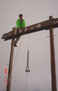 身体を固定し、鐘下ろし作業もスムーズに進む。 雨具を着けての登山を覚悟して出発しましたが、天候は徐々に回復し、順調なペースで登りました。猿や熊に出会うことなく、いい汗をかきながらの登りでした。