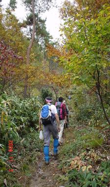 雨は次第に本降りになり雨具を着けての下山となりました。足元は落ち葉で滑り、注意深く下っているつもりなのに何度か尻餅をついてしまう。 登り口に着く頃には、雨で濡れ、雨具で蒸れ、ズボンは笹薮で濡れ、登山靴の中までも・・・・4人共まさにずぶ濡れの状態でした。 乾いた衣類に着替え、山路さんに向かい、あったか~い温泉に浸からせていただきました。身体が温まり、程よい疲労感に身も心も大満足の一日となりました。ありがとうございました。