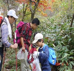 ここから少し急なくだりが始まる。歩いていると石橋さんがナラタケを発見。私は朽ちた木の周りに出た沢山のキノコを初めて見ました・・とても感動です。それからは、あっちこっちでキノコ探しが始まり、それぞれの手にはキノコが沢山入った袋がお土産となりました。川部には予定の1時に到着。