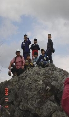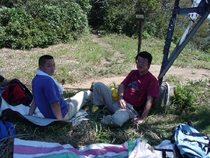 ポツポツと雨が当たりはじめ、昼寝もそこそこに下山開始、山頂から少し下ったところで記念撮影。