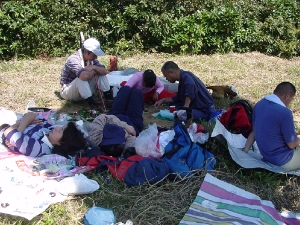 10時05分 飯豊連峰展望台着、反射板のある草地で暑い所だったが、ここで昼食にした方が良いという意見があり、豚汁作りにとりかかる。ビールで乾杯しイロイロなご馳走をよばれて昼寝もして、幸せな気分。