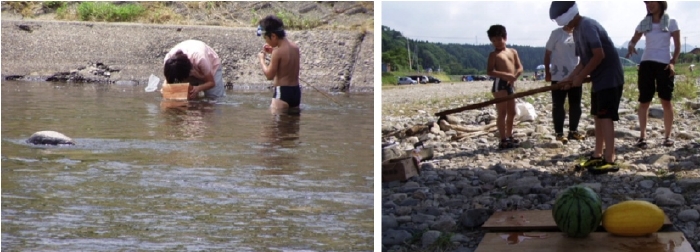 今回はワッパ汁を作る予定で石を洗い火で加熱。鍋の中に野菜を沢山入れてそこへ焼け石を入れる。煮汁が沸き立ち15分でおいしいワッパ汁ができました。取れたばかりのカジカを須貝さんにから揚げでおいしくあげてもらい、脇からツマミ食いすると、皆から「おいし-い」の声。今だから出来る自然食体験。素麺流しではやはり夏の涼を求め参加者全員大変好評でした。五十嵐さんちの農園でできたおいしい有機農業によるとうもろこしを食べたり、今回参加できなかったけど阿部さんちの脂ののった肉(来年は参加ヨロシクね!)、スイカ割りに使った小林農園の少し出来が不安だったけど「金の玉?」の黄色のすいかも何とかスイカ割で食べることが出来ました。カジカ取りも最初取れなかった子供達も、取れるようになり沢山取れたカジカの大漁にびっくり・・・。楽しい1日でした。今回川遊びに色々協力してくれた皆さんに担当よりこの場を借りて「ありがとうございました」!!!! \(^。^)
