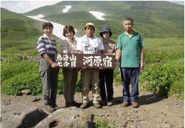 後から登ってくるツヨミさんから「この花何だっけ?」と、声がかかる、うん・・「俺に花の名前聞かないで・・」知っているのはニッコウキスゲとヒメサユリくらいで花音痴なのだ。河原宿は大草原で小屋の前には心字雪渓からの沢が流れていて外輪山が遠望でき絶景である。残念かなニッコウキスゲは少し早いようだ。