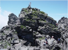 無事に雪渓を渡り終えアザミ坂の登りにかかる、ここでは数種類の花が咲いていたが名前は右の耳から左の耳へで全く情けない、まあ美しい花だった・・で、良しとしよう。10:30外輪山尾根に上がる。外輪から見る千蛇谷雪渓は思ったより雪が少なく登山者がアリの行列である。天気は良いのだが高曇りで日本海は見ることが出来ず残念だ。外輪を回りこみ七高山の鞍部に荷物をデポして新山をめざすが大渋滞、順番待ちで時間がかかりそうなのでとなりの岩塔頂上で記念写真を撮る。鞍部に戻り12:00雪で冷やしたビールで乾杯する。皆さん昼寝中に七高山へ行ってくる、七高山も登山者で混雑して休むところがないくらいだ。月山に登っている会社の先輩にメールすると「こっちも天気は良いけど混雑している」との事だ。