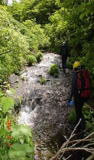 小川に入り靴に付いた泥を洗い流す。岩渕さん差し入れの甘酸っぱいりんごが心地良い疲労と渇いた喉に