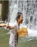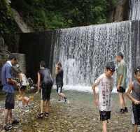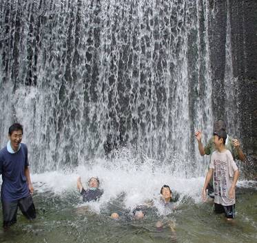 皆で上流まで行くと、二段の堰堤があり、水しぶきを上げている。