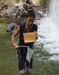 ニジマスを取ろうと皆で川の中をじーっと見つめているが、なかなか簡単に、捕まえられない。