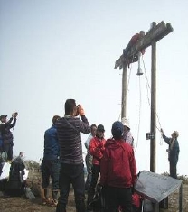 皆で協力し、手馴れた順序で作業開始!作業が終わる頃には陽が射し始め、山頂は人も増えてきました。