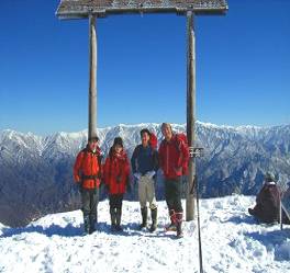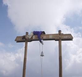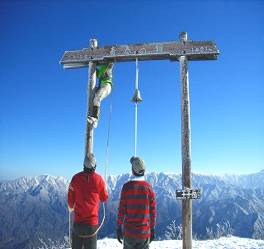 6時40分に二王子神社に着くと先に車が2台。さすがにここにはまだ雪が無い。我々も全員長靴をはき出発。最初は4人そろって登っていましたが大川原さんと遠藤さんは高速走行(まるでスポーツ車)でハヤイハヤイ。頂上まで何回もお二人に待っていただきました。四合目付近より雪が現れ、頂上では約20-30㎝の積雪。空は雲一つ無い快晴で山頂から雄大な白銀の飯豊の展望(本当に感動しました)を楽しむがすぐに鐘下ろしの作業が始まる。大川原さんが登ることになり、鐘をはずそうとするがシャックルがなかなか外れなくて苦戦する。ようやくはずした鐘を私も持たせてもらいましたが結構重いのに驚きました。支柱の上は大変寒くて大川原さんの手は凍傷寸前?になりました。