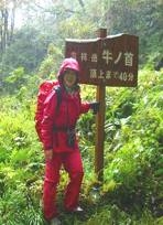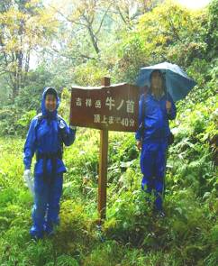 朝7時半に五十公野公園集合。大川原さんと小林の車に分乗して出発。今回は、新しく入会した菅原さんも参加。残念ながら、雨で湯蔵山には行かなかったが今回の山行がモンテの顔・印象に繋がるかと思い担当の気持として少し緊張し、また責任もあるなと思いました。登山口までの車中では、天候が晴れては気持がハイになり、雨が降っては落ち込んだり、それは私ばかりではなかったようです。そして、「吉祥岳登山口」の看板の前につくと、今回の予定を軽く皆に話して、沢コ-スから登り、下山は尾根コ-スで下山することにした。登り始めだけ晴れていたが終始雨降り。沢の渡渉も数箇所あり、増水した場所の渡渉は長靴を持参の人はそれなりに渡渉できたが、沢の水深が深く登山靴部隊の人にはつらい。現在位置確認をしながら、先に進むと沢の中に「吉祥岳 牛の首・頂上まで40分」の看板・・・ここで、菅原さんと小林両名の記念撮影。