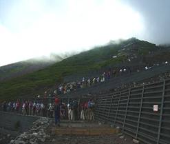 登り始めは緩やかな下り。この時間に下山してくる人とすれ違う。(かなりぐったりしてる人もいる)6合目を過ぎると、ジグザグの道で大渋滞が始まる。老若男女、日本中・・?いや世界中から?と、思うほどの人で溢れんばかりの登山道でした。