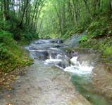 沢の両岸には緑のブナ林が広がる。ブナの木が沢にせり出して「緑のブナトンネル」になっている。澄んだ空には鳥がさえずり、水面はキラキラ輝き初夏のさわやかな風が吹き抜ける。沢の深みには、イワナらしき魚がちらほら。聞こえるのは風の音と沢の音だけ。