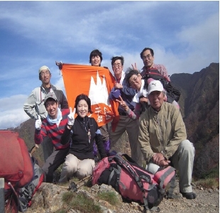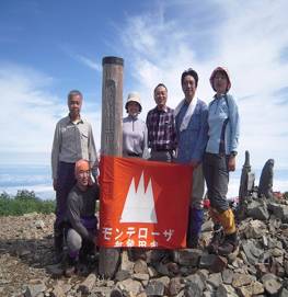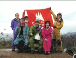 休憩を取り、烏帽子岩へ向かう、烏帽子岩は風が強く、とても寒い。次々と下山してくる人達が通るが、モンテのメンバーはなかなか見えない。13時まで待つことにしようとモンテの旗を出し、写真を撮ったり、遠藤さんはストックにモンテの旗をつけ振ったりしていたら、岩の上部で手を振る人が見える。モンテの誰かと思い待っていたら、岩渕さんが急いで下ってきた。小林(美)さん、菅原さんと最後に近藤さんと、今日の労をねぎらい全員で写真に納まる。今日の目的の一つでもある。