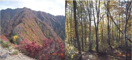 参加メンバー中 岩渕さん以外は体調が良くなく、私が先頭になり遅いペース(30分行動5分休憩)で岩岳、烏帽子岩と順調に進む。尾根は広く さほどの急登でもなく、周囲の山々は、紅葉真っ盛りで快適であった。烏帽子岩を過ぎるとやせ尾根となり鎖場も待ち構えていた。このあたりよりバテ気味になり、ようやく4時間30分で頂上到着。飯豊方面はややガスがかかっていたが、まあまあの風景。1時間ほど昼食休憩をして下山開始。1時間くらいして持病の痙攣が発生した。なんとかバンテリンを塗り塗り持ちこたえ、縦走隊の待つ烏帽子岩にたどり着いた。ゆっくり下山で15:30登山口に到着。