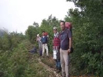 ここよりコンクリートの階段登りが電波塔まで続く。やや狭い松やブナ林の尾根を2回ほどアップダウンし順調に登るが、日頃の運動不足の為疲労気味の自分にペースを合わせてもらいながら休憩を3回ほどしたあと北ノ峰に到着。頂上とカン違いし昼食とする。他のパーティと五十嵐さんが次の峰に行ったので、休憩後に行ってみるとそこが昔懐かしい風倉山山頂(西ノ峰)だった。