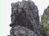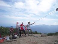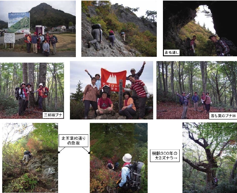 登りは急な岩場の連続でしたが、整備された登山道はロープや鎖があり岩場には所々にステップがありました。「夫婦松」や、松の枝が穴から何本か出て鼻毛に見えたことから「鼻毛通し」といわれる所を見ながら1時間半ほどで山頂に着きました。尖った山なので山頂は狭いのでは・・・?と、思いましたが思ったよりも広くぐるりと360度の展望を楽しめました。のんびりと食事をして下山。