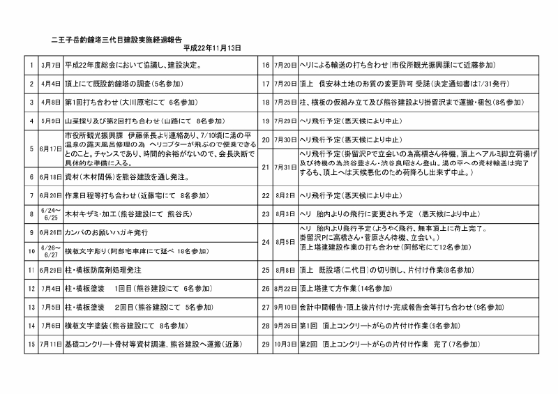 今年4月から10月にかけて、二王子岳頂上の三代目釣鐘塔建設にむけて活動してまいりました。