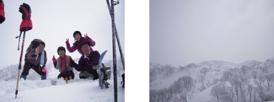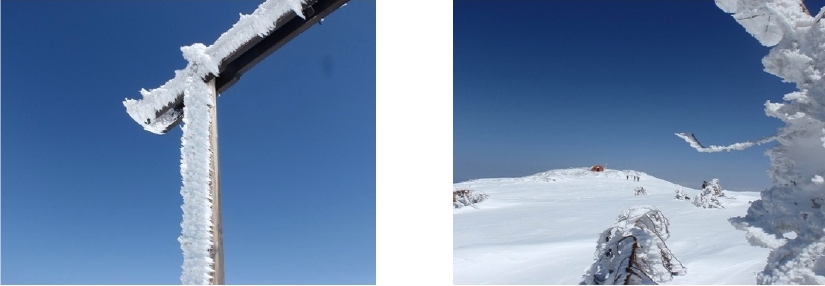 山頂からは、青空と樹氷と、い~い眺めでした。小休止後三の峰に戻りテントの中で賑やかにランチタイム、陽が射したテントの中はポカポカ陽気で暖かかったです。