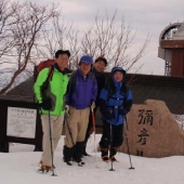 雪道を進み小屋へはこの日の一番乗りでした、テーブルをセットして山頂まで周辺散策に出かけました。キノコは手の届かない高所ばかり。山頂から飯豊方向はガスで見えませんでした。記念撮影・・・あれ?高橋さんがいない―キノコ探し中でした。