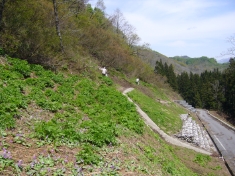 そのうちに戻って来るだろうとウルイ採り場に登る。二人で採っていると近藤さんが登ってきた。