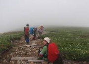 ヨッピ橋 二日目は、朝靄のなか、ヨッピ橋を経由してゆっくりと竜宮十字路へ、ここからあやめ平を目指しますが、足の調子が悪い菅原さんは、真っ直ぐ山の鼻から鳩待峠へ向かうことになりました。あやめ平へはチョットきつくて長い行程でしたが、湿原にでたときは標高を感じる広い景色に驚きました。昼食時間には木道のベンチに大人数のグループと一緒になり、何十年前にこの湿原で踊ったと言う話しに盛り上がりました。(湿原が荒れてしまった原因?!)
