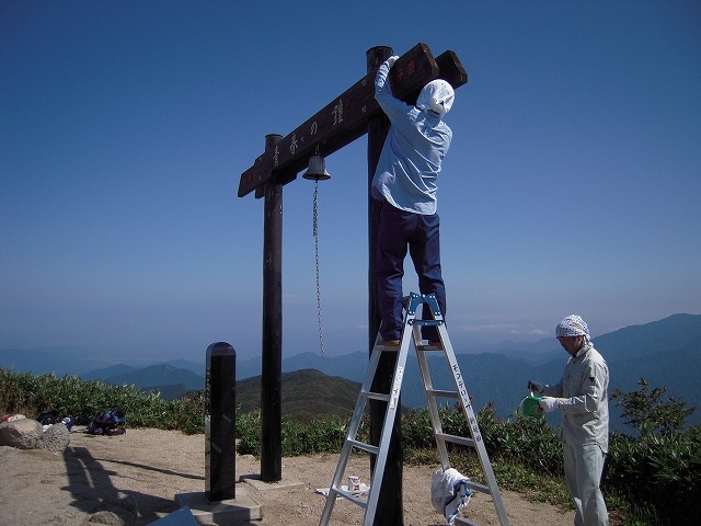 村上からの二十数名の団体さんが登ってくる・・という話を聞き、その方たちが着く迄の2時間で塗ってしまおうと、三人で手分けをして作業を開始。鐘とチェーンのカラビナは既にしっかりしたものが着いていました。(須藤さんが替えて下さったとの事です。)