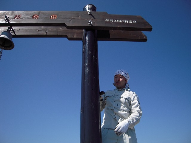 町内の草取りを終えてから登ってきた阿部さんと”ペンキヌリタテ”の板を持って記念撮影。