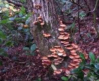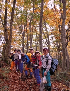 登り始めは杉林、それを過ぎるとブナの原生林となり(樹齢は150年~250年とのこと)よく整備された登山道は落ち葉でフカフカ、椿の群生地を過ぎ瘠せ尾根になるとナナカマドが多く見られ最後の急登を登りつめると山頂、休憩、キノコ探しを含めちょうど2時間の行程でした。頂上は狭いながらもぐるりと周囲が見渡せ、スッキリ晴れていたら遠くまで見渡せたでしょう。