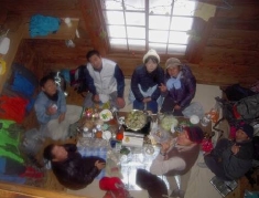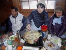 小屋に戻り、鴨鍋の準備、今回は大鍋なので時間がかかり煮えるまでの間それぞれが持ち寄った美味しいものをつまみに乾杯ー!出来たて熱々の鴨鍋で身体を温め、ノルマのおかわりを達成し、もう、お腹いっぱい。・・・なのにケーキを見るとベツバラが出来 入ってしまう不思議。さらに今年も高橋さんから豆腐を使ったケーキの差し入れがあり、皆の宇宙空間のようなお腹に入っていきました。(ご馳走様でした。)