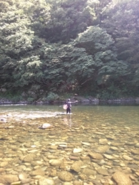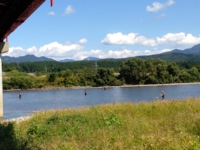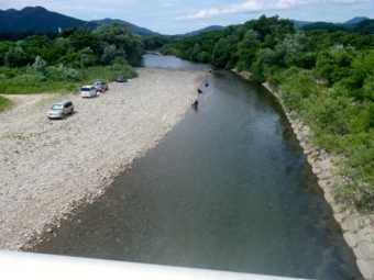 車を止めるとグループの一人が側に来たので釣果を聞くと15匹位と教えてくれた。Hさんの方に向って「おおーい」と大きな声で呼んだ。二人は気づいて手を振って答えてくれた。Hさんは親父と違って普段は口数は少ないが、鮎釣りは上手な人だ。