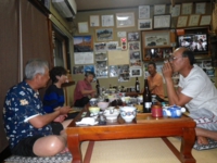 OさんとSさん奥にWさんとYさん夜、Oさんから竿を流した話を聞く。話によると親父と別れた後に転んで竿を流してしまい、下流に移動して釣りをしていた上関のOさんに声をかけて拾ってもらったのだと言う。「Oさん本当にお世話になりました。そして、有り難うございました」。あの場所は浮き石が多くて足が取られやすい。少し足が不自由なOさんには難しい場所だったと反省する親父であった・・。