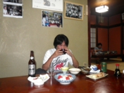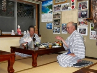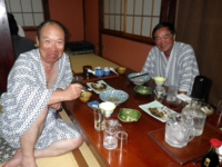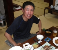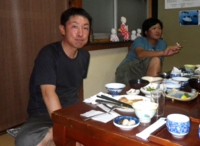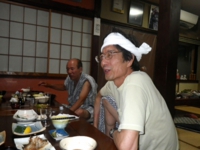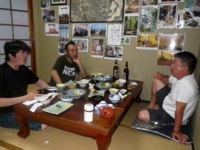 夕食と鮎談義するOさん夕方には10センチ程水位が下がっていたので、明日はもっと釣りやすい筈だ。先に川から上がっていたFさんが車で迎えに来てくれた。Fさんは10匹程の釣果だったそうだ。まだ、何処でも釣れる訳ではないが荒川の鮎が釣れ始めてきたことは間違いないだろう。8月に入れば本番である。夕方、三面川で釣りをして宿入りしたOさんに三面の様子を聞く。三面は午前中は凄い雨だったらしい。釣果は20 匹だったがサイズが小振りと話してくれた。明日は荒川で竿を出すと晩酌しながら楽しそうに談話。親父は何処で竿を出そうか・・。