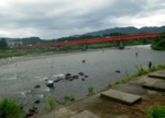 橋の近くの瀬に2人は竿を出していた。川を見て、水量が多いことに気付く。しばらく観ていると釣れている。跳ね鮎も多く、鮎が活性している様だ。師匠曰く「釣れるよ」。場所を小見橋との中間点付近に移動する。ここで、親父も支度して川に入る。師匠の竿には鮎が掛るのだ。親父は3時まで竿を出したが9匹の釣果、バラシか゛6匹もあった。師匠達は下流を探りに行き、親父は宿に戻った。