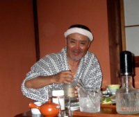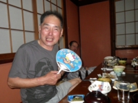 「今日泊まれる、優勝したよ」「うそ!」「本当だよ」「良かったねぇ」M師匠と親父の会話であった。師匠は小国川で開催されたG杯の予選会に参加していたのだ。夕方、優勝カップと賞状を持って宿入りする。夕食後に3人一緒に記念撮影することに・・。撮ってくれたのは同宿した鮎釣りのお客さんだ。皆さんも一緒に喜んでくれた。妻は自分の息子が優勝したかのように嬉しそうであった。近年、大会に出場する師匠は「旅館山路」と書かれているベストを着て試合に臨んでいる。このベストはM師匠が当館を守り立てようと、もう一人のi師匠と「鮎フィッシングチーム」の発起人になり、メンバーが着ているベストである。