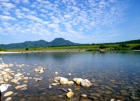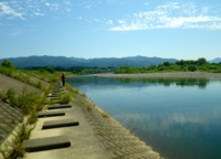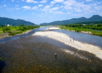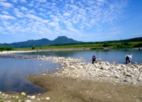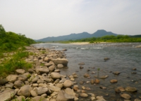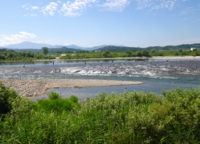 鮎談義で盛上がるYさん達とMさん達家に帰る途中、堤防上から見ると農協裏の左岸に釣り人が居なかったので竿を出してみることに。浅い瀬で4匹釣れたがバラしも4匹あった。周りの釣り人もほとんど釣れていなかった。6匹の釣果であったが、のんびりと竿を出せたのは良かった。そういえば先日帰った静岡のYさん達や群馬のMさんも、「この時期は10匹釣れたら御の字だよ」て言っていたっけ。夕方に福島からの2人が宿入りする。