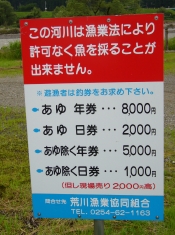 昨日から宿泊しているFさんと二人で荒川で竿を出すことにした。朝に川を見ると濁りがやや濃い様だ。二人の体力等を考えて、温泉橋上流の2本に分かれる場所に決める。ここは最近いつも数羽の鵜が占領している場所だ。Fさん曰く「鵜がいる所に鮎がいる」隣のオトリ屋の親父曰く「いても石に潜って出てこない」山路の親父曰く「濁っているから大丈夫」。と、へんな理屈をつけてこの場所からスタート。川の中には食み跡はある。仕度をしてオトリを放した途端に釣れた。さい先が良いと後が気になる。親父は悪い事が多いから。3匹釣れたが後が釣れない。中州に渡って雲母側に行く。瀬頭で3匹、下って温泉橋の上の橋桁の上で4匹釣って右岸に渉る橋下で6匹釣って川から上がる。タモの受けそこない等で4匹バラしていたので、みんな釣れていれば20匹になるのだが・・。サイズは17〜18㎝の鮎だった。