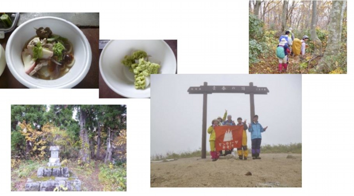 早速、二王子恒例の鐘下し作業に、私はただ見ているだけです。渋谷さんが小屋より三 脚を出し、山頂で写真を撮り、鐘下しです。私は三脚を押さえるだけです。渋谷さんの 下した鐘を私はこの手で初めて持ってみました。けっこう重いので両手でしっかり持た ないとダメ、。阿部(ツ)さんがなにやら私の口の中へ押し込みました。両手のふ さがった私です。口の周りがチョコだらけの顔に、岩渕さんがすかさずシャッターをパ チリ、 やられましたネ、。でもすごく嬉しかったです。夢にも思わなかっ た鐘下し作業に参加出来たことに感謝しております。頂上はやはり何も見えず残念。小 屋へ引き返し、岩渕さんの果物を頂き軽食をとりすぐに下山(10時24分)。すると 8合目あたりからなんと薄日が差してきたのです。紅葉が美しく映えます。新発田の街 もよく見えます。雨具もいらなくなり、水場で美味しい水を味わい、阿部(ツ)さんか ら梨などを頂きルンルンです。(晴れ老女)すると朝の青年がまた登って来ました。忘 れ物?いいえ2回目の登山でびっくりです。あ、ぁ、私も40年若ければ、でも無 理だわー。早く一王子小屋に入るのが楽しみだ。阿部(ツ)さんは、昼食の用意のため 一足先に走って下って行く。会報で知っていたのですが凄いですね。「カモ肉、豚肉入 り特製野菜きのこ汁うどん」でしょうか?とにかく美味しい!そして「ズンダ餅」は絶 妙な味です。他にも岩渕さんの海苔巻、漬物など、心も体も温まりました。前日からの 準備、材料の仕込みに本当に頭が下がります。あの大きな荷物はみんなの為に背負って きたのですね。阿部夫妻に感謝です。ここで私の一つの目的を白状します。昼食会を何 より楽しみにしていました。(花よりダンゴ老女) 「若さ+リュックの重さ=老体+リュックの軽さ」でご理解ください。