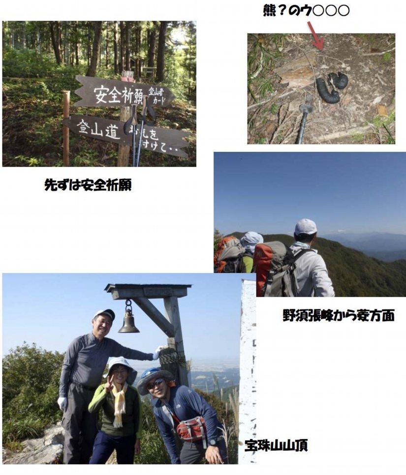 五十公野公園駐車場6時30分集合、岩渕さんが急遽行かれなくなり3人となりまし た。縦走の為、渋谷車と小林車2台で出発。菅原車は新車なので今回の山道は辞退し、 アルプスに行く時に車を出しますとの事です。下りる予定の石間登山口では、地元の人 たちが道整備の草刈りの作業中でした。刈り終えたばかりの道の端に小林車をデポし、 渋谷車で石戸登山口向かいました。石戸登山口への山道もとても細いのですが、駐車場 は砕石場の跡?で広いです。仕度を整えて7時50分出発。登り始めに小さな祠があり ました。10分ほど登った所で、渋谷さんから「念の為に聞くけど、車のカギ持った?」 と聞かれました。そこでやっと車にカギを忘れた事に気付き、渋谷さんが取りに戻って くれました。申し訳ありません。8時25分再出発。登り出して直ぐ、道の真ん中に真 新しい大きな熊のウ○○が出迎えてくれました。登りは私には結構な急勾配で、アップ ダウンがいくつも続きます。天気が良いのに風がなくて暑かったです。山の稜線はうっ すらと赤く見える程度でしたが、周りの山々と下に見える三川のゴルフ場のグリーンが きれいでした。10時釜場清水。水場に続く道(渋谷さん確認)と二股に分かれて、そ こを右側に進みました。11時野須張到着。菱から宝珠山縦走の分岐で開けて視界良好、 順番に写真撮影しました。お腹もすいてきましたが、昼食はお預けで先に進みました。 野須張から左へ進んで、11時40分大蛇山到着。ピッケルを持ったかわいいお地蔵さ んが建っています。ノンアルビールが出て乾杯し、ゆっくりと昼食をとりました。12 時50分大蛇山出発。お腹が満たされた重い身体では歩みもきつくなり、稜線の先の宝 珠山までとても遠く感じられました。13時35分宝珠山到着。やっと登山者に会えま した。登山口から野須張、大蛇山、宝珠山までの登山道は道幅もあり、きれいに整備さ れています。稜線の道の真ん中には、昔の安田町と三川村の名が付いた境の杭が続いて 打たれています。道も眺めも良いルートですが、他に誰ひとり出会わない貸し切り状態 でした。宝珠山では風もあり、少し涼しくなった所で、新潟から来られた御夫婦に写真 をお願いしました。御夫婦はこれから下るルートを登ってきたとの事、詳細をお聞きし て13時50分下山しました。草水口と石間口の分岐を心配していましたが、知らぬ間に通り過ぎていました。一気に下る道で、眼下に49号線と阿賀野川の景色が見えてき ます。道の所々に熊よけの鐘(炊飯器の釜や鉄パイプ)が吊るされていて、鳴らしなが ら下りました。15時、石間登山口到着。デポしていた小林車で、石戸登山口まで渋谷 車を取りに行きました。もし渋谷さんの一言がなかったら、石間から石戸までの4,5 キロを歩いたかもしれません。国道をヒッチハイクでしょうか。良い教訓になりました。 帰りは宝珠温泉で入浴し、さっぱりして新発田に帰りました。
