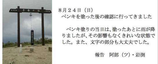 一方、健脚の後発隊は、責任を果たすべく暑さのなか快調にペースを上げ、12時に 山頂に到着し、昼食を挟みながら、ペンキ塗りを完了した。このたびは天候の悪化で一 回塗りとなったが、西側の痛みの激しい場所は一部二回塗りが出来た。なお、ペンキ塗 りの際は、山頂に着いた小学生や興味深そうに眺めていた登山者を巻き込んで塗り終え たとのこと。そして、塗り終えて30分後に雨が降り出し15時下山開始、三合目付近 では激しい雷、16時30分に無事下山したとのことでした。