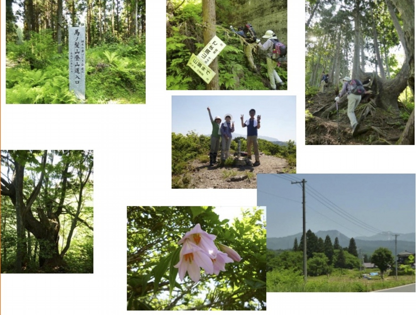 岩渕さん、山﨑さん着。予定時刻の7時に五十公野公園を出発する。車内で岩渕さん より前回の会山行(守門岳・入塩川)の報告を楽しく聞かされ羨ましく思う。山﨑さん からは会山行の米山と山開きの二王子岳を近藤会長、伊丹さんと行って来たとの事、こ れまた羨ましい。何時の間にか登山口に着く、7時40分。7時47 分、登山開始。すぐ砂防堰堤が見え、その脇を登り増谷沢沿いに進む、苔の 付いた石はヌルヌルし滑りやすい注意しながら渡渉を16回程繰り返すと尾根の取り 付きに着いた。8時7分、馬の「たて髪」部分に当たる尾根道を登る、なかなかの急登である、尾根つたいにある天然杉は見事である(天然ぼけの三人は休憩の合図を「ヒヒ -ン」と決めた)、五葉松、ブナもある。どこからか「ヒヒ-ン」の声が聞こえる一服 休憩の合図である、またまた「ヒヒ-ン」の声が「ヒヒ-ン」「ヒヒ-ン」-----。尾根 道には、あちらこちらに首長族の様なイワカガミ?が首を長くして咲いていた、ヒメサ ユリも一輪だけ我々を出むかえてくれた,一輪だけに喜びは倍返しだ。チゴユリは群生。 半鐘ズルと言う名の花も(岩渕さんによると、花弁が白色で半鐘の様な形をし、ツルが 有る。)咲いていた。下界は、30°C位には成っているだろう、急登も天然杉などの大 木が日差しをさけてくれ助かる。時折沢からの涼しい風が何よりのプレゼント、胸のボ タンを一つ外しこのプレゼントを身体全体に受け止める。9時 15分ようやく急登が終 わり扇の平に着く。名の通り平坦な所、ここでは「ヒヒーン」の声は聞こえない。 9時30分今年の干支山「三等三角点のある馬ノ髪山757m」に着く。山頂は360 度の大パノラマで、残雪の飯豊連峰の美しさは格別。刈り払いの行き届いた山頂は直射 日光が容赦なく降り注ぐ。「あっちぇー」お約束のビールで乾杯、そして記念写真。10時6分、下山開始。急な下りの途中に抱き付くのに最適な杉があり、昔を思い出 し抱き付き胸キュンしながら無事、急な下りを終える。ヌルヌルの増谷沢には赤ミズ・ 青ミズがあり晩のご馳走にと少し頂く。11時20分、登山口着。帰りは、上網木集落から新発田方面とは逆の新谷川方面に向かい今日、登った馬ノ髪 山の全容を確認し、五十公野公園駐車場へと車を走らせた。12時、五十公野公園駐車 場にて半日登山を終了した。