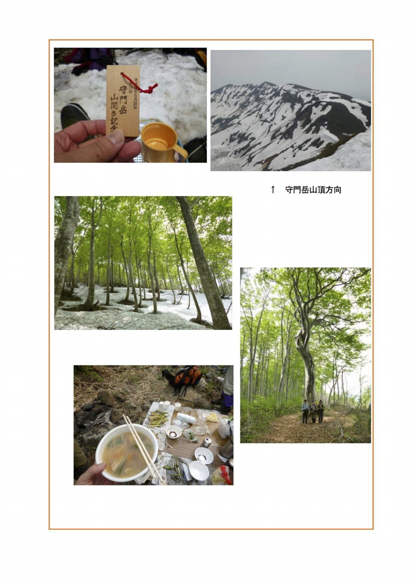 当日は会山行の守門登山と重なっていたので、山田さんに両登山の緊急連絡先をお願 いした。安全祈願祭は、二王子神社拝殿において市・県の議員、関係官庁、山岳会関係 者等の来賓が多数参加し登山の安全を祈願した。安全祈願祭終了後の午前8時過ぎに登 山口を出発。平成22年の三代目釣鐘建設以来の二王子岳登山で体調を考えると心配で あったが、やはり持病の痙攣が足にでてしまった。だいたい3時間を超えるとでるみた いで他の二人に先に行ってもらうことにした。足に何回か経皮吸収鎮痛剤を塗りながら ようやく5時間かけて頂上に到着した。天候は曇りで展望はいまいちであったが、新緑 と残雪のコントラストが綺麗で伊丹さん、山崎さんとも満足げの様子であった。