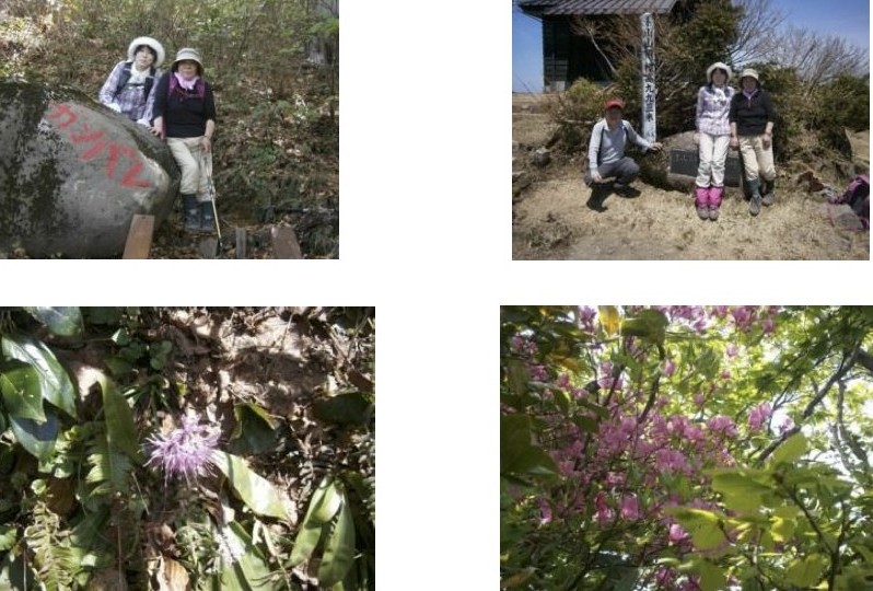 登り口から整備された木道の登山道をゆっくり登りました。近藤さんが「新潟花の山 の本には米山入っていないけれど、いろいろな花が咲いているなあ」と言う通り、二輪 草・ショウジョウバカマ・岩鏡・すみれ等が咲いていました。そのうち、近藤さんが、 イカリ草(いかりや長介)椿(あんこ椿は恋の花都はるみ)キクザキイチゲ(市毛良枝 好きだなあ)などと、言い始めたので楽しく登ることができました。10時、二の字の 広場に到着、目の前に頂上小屋が見えましたが、(771mの標柱)まだ3分の1も来 ていないの?と歩き続けていると、近藤さんから今度はくずまんじゅうを頂き、力を蓄 えガンバリ岩(大きな岩にガンバレと書いてある)までがんばろうと声をかけてもらう。 途中新緑がとっても美しいブナ林で写真を撮ったり、遠くの山並みを見たりしながらつ いに11時15分、「ガンバレ岩」に到着しました。ここから頂上まで40分ぐらいか かるとの事、ガンバレ岩からもらった元気を糧に登り続けました。途中[巳羅場]という 昔は女の人はここまでしか登れなかった所に来ました。今は登ることができて良かった ねと言いながら進みました。(女じゃなくなったから大丈夫なんて声も聞こえてきまし たが・・・)12時、山頂に到着。皆で薬師堂をお参りして一等三角点にタッチ、その 後記念撮影。晴天のもと遠くの山々を眺め、ノンアルコールで乾杯し、お昼をゆっくり と食べました。途中若者の元気な声が聞こえてきたので、見ると「新潟産業大学」の旗 を持った学生でした。日当たり良好で暑くなったので、避難小屋で涼み下山することに しました。
