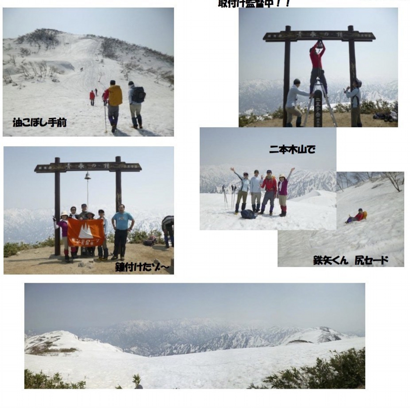 ランチ後、お天気も良く時間も早いので「二本木山」に向かいました、 九原君は鉄矢君の後をしっかり付いて歩きその後ろから私は遅れ気味・・・25分ほどで山頂。初めての二本木山山頂からは手を伸ばすと大きな飯豊が届くような、それ程近 くに感じられました。二王子岳も良く見え登山者が次々に登っていくのが見えました。 登り返して9合目の雨量計へ、油こぼしは尻セードで滑り、その後も3ヶ所尻セード、 恒例のお楽しみで大いに笑い皺は増えましたが気持ちは若返りが出来ました(^^) 青年達は、シートに二人乗りで尻セード、ズボンがビショビショでしたが、こちらも大 笑いで楽しそうでした。5合目、2合目で小休憩をして無事神社着。