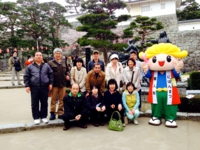 二本松と謳うだけあって石垣に松の光景 が素晴らしい。桜を観ながら天守閣のあった場所まで登る。膝の痛みと体力不足が頂上 までキツかったが何とか登って安達太良山を観る。智恵子の心象にある安達太良山の青 い空とは違って花曇りであったが、春の陽光が気持ち良かった。城の入り口で全員で記 念撮影する。近くにいたユルキャラにも入ってもらってハイパチリ。