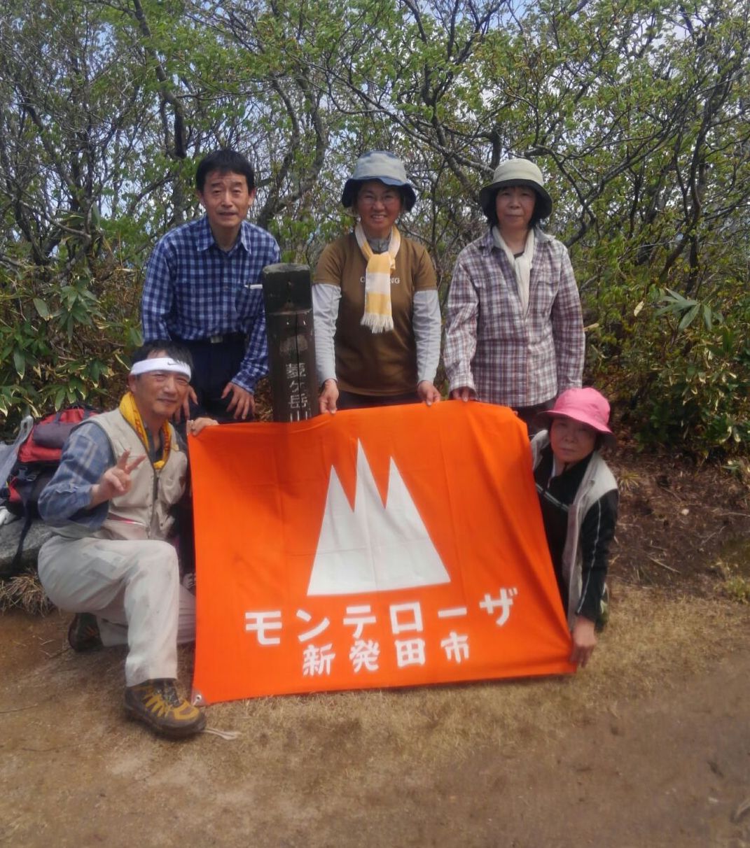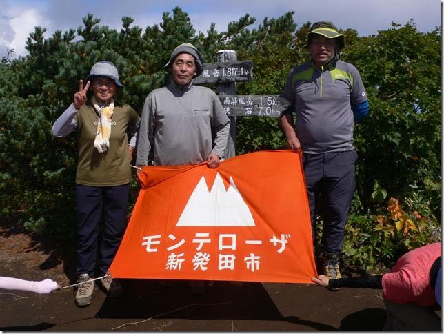屏風岳 山頂沢山のハイカーが山頂に陣取りして、少し早い昼食をしていました。早速、参加者でモンテローザの会旗を持って記念撮影。他の登山者から、「え~、格好良いねー」と絶賛。「どこで活動している会ですか?」、「自分たちもこんな立派な会旗を作りたいね」。とか、色々声をかけられました。「新発田の二王子岳行った事あるよ」という人がいて、調子にのって思い切って「青春の鐘のモンテローザ」とか、「ホームページも開設」と宣伝してみました。きっと「あ~、あの有名なモンテローザ」とわかる人いるかなと思いつつ、期待を持ちました。が、残念、誰も知る人はなく、頭をかかえている人ばかりでした。「まぁー、こんなもんだ!!」と思いつつ、さっきの笑顔や威勢は無くなり、静かに会旗をザックにしまい、昼食にしました。元気も威勢もなくなった所で、景色を堪能。あまり目にしない仙台市の市街地、太平洋の海原が微かに見えて、新鮮な山の雰囲気でした。自分達が出した山のゴミと、楽しい、素晴らしい秋山の思い出をザック一杯に詰込み下山しました。今回、初めての山頂に行けた事は有意義で新鮮でした。下山後は、蔵王の共同露天風呂に浸かり汗を流し帰宅しました。担当の渋谷さんありがとうございました。